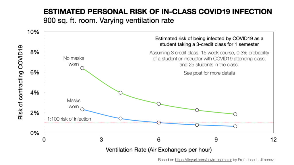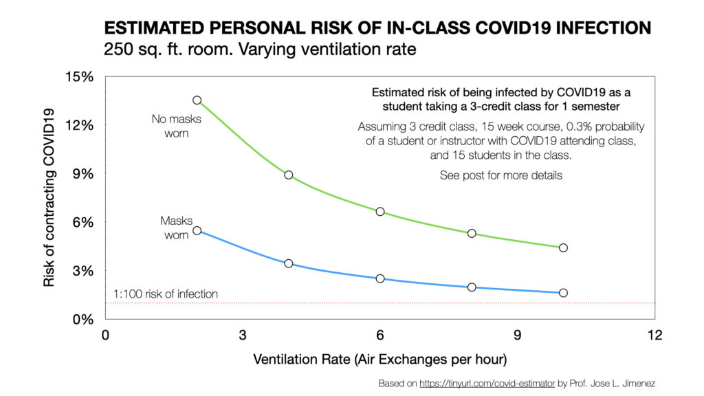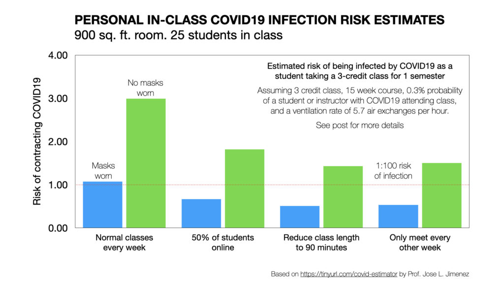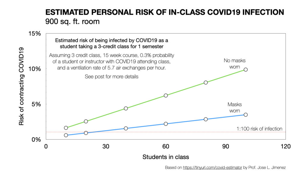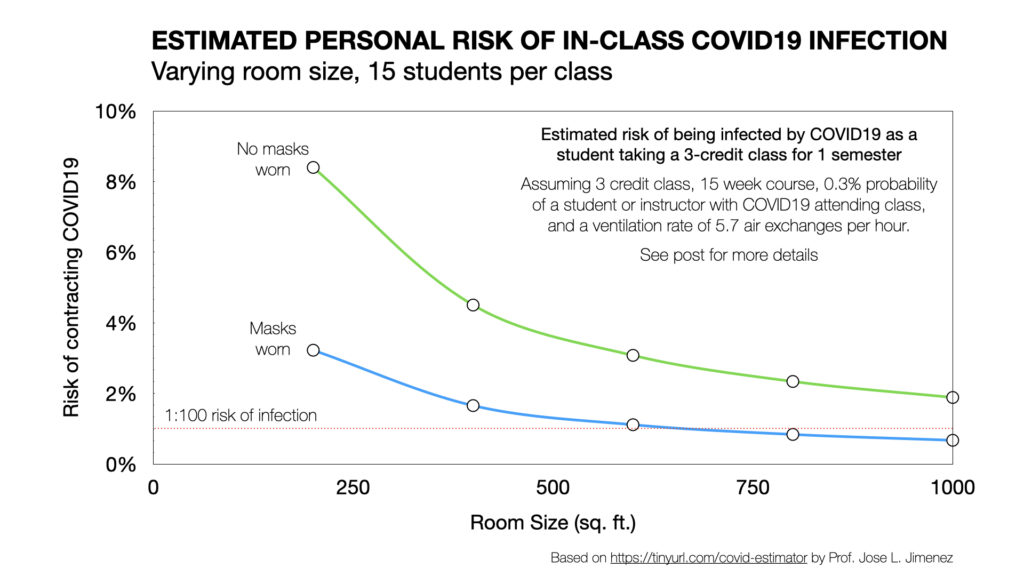 Building on this work, Dr. Jose Jimenez — a co-author on the Skagit paper, and colleague of Miller’s at the University of Colorado Boulder — has created a useful spreadsheet-based model that estimates the probability of becoming infected with COVID19 while attending class, if someone else in the room is infectious.