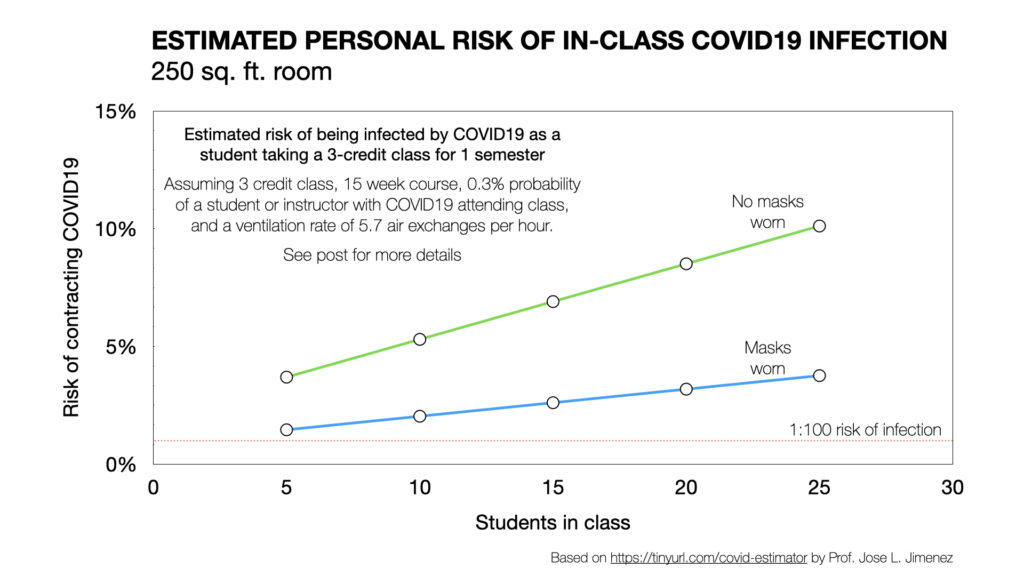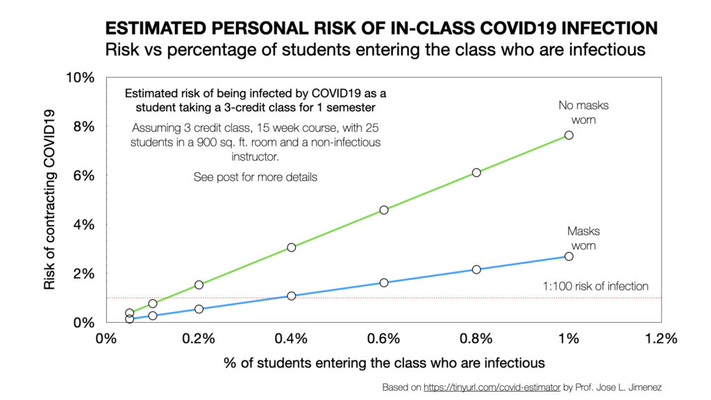 The analysis is based on 25 students in a 900 square foot class (relatively low occupancy), and estimates risk of contracting COVID19 as a function of percentage of students on campus who are infectious while attending class. And so, if the percentage of students who are infectious is, on average, 0.2%, and everyone’s wearing masks, the model estimates the risk of being infected over the course of a semester if you’re attending the class is a little over 0.5%. On the other hand, if 1% of students are infectious (which sounds high, but maybe not that high if we’re still struggling to contain the virus), that risk goes up to 2.7%.