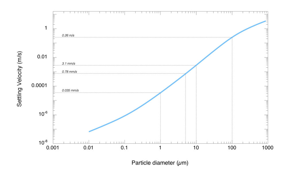 Figure 1 below shows the terminal velocity of unit density spherical particles in still air — the velocity they reach as they fall under the influence of gravity. This in turn allows an estimate of how quickly particles of different sizes will settle out of the air, and how long they’ll remain airborne after being released.