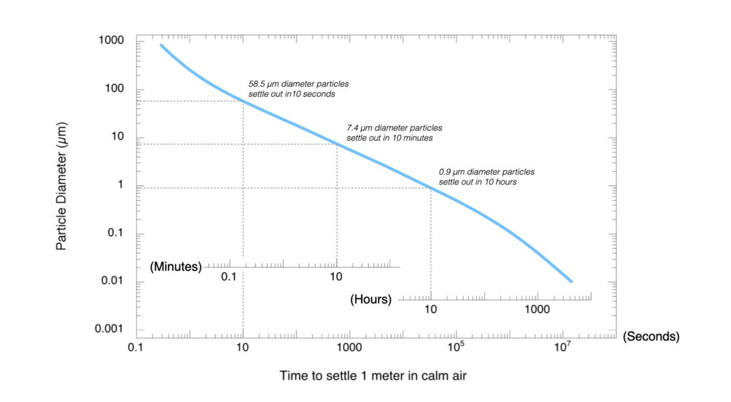It’s an increasingly important question as the relevance of airborne transmission of novel coronavirus becomes apparent. Yet despite the science of aerosol dynamics being very well established, it’s surprising just how hard it is to find clear and understandable information on the settling rate of airborne particles.