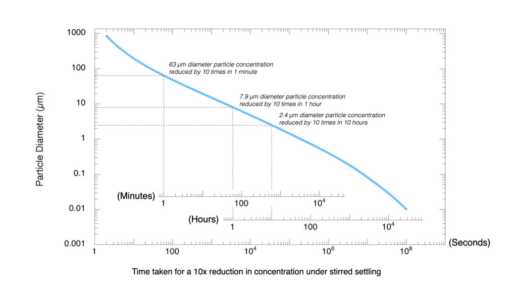 Using a ten times reduction in aerosol concentration as the benchmark, figure 3 below indicates how long this is likely to take as a function of particle size: